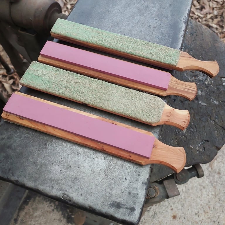 set 2 en 1 pierre grains 3000 a huile 15cm sur 2cm autre face cuir avec pate a polir sur plaquette en bois d olivier ou bois de cade / Prix 50€