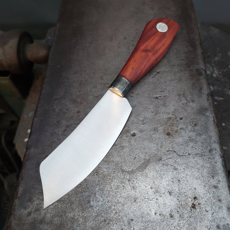 Cuisine 21.5cm/ lame xc75 1.5mm au dos longueur 10cm/ virole acier noirci / blason et l avant de la virole inox/ manche narra / ...VENDU...