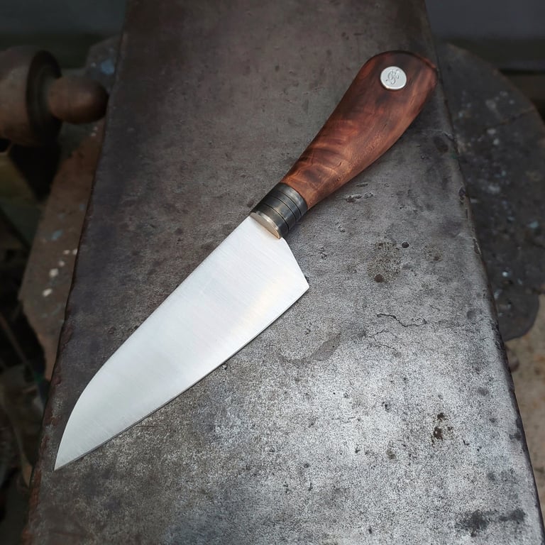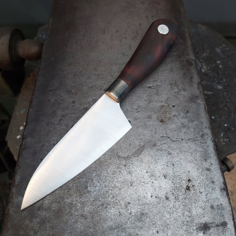 Cuisine 21.5cm/ lame xc75 1.5mm au dos longueur 10cm/ virole acier noirci / blason et l avant de la virole inox/ manche cade brulé/ ...VENDU...